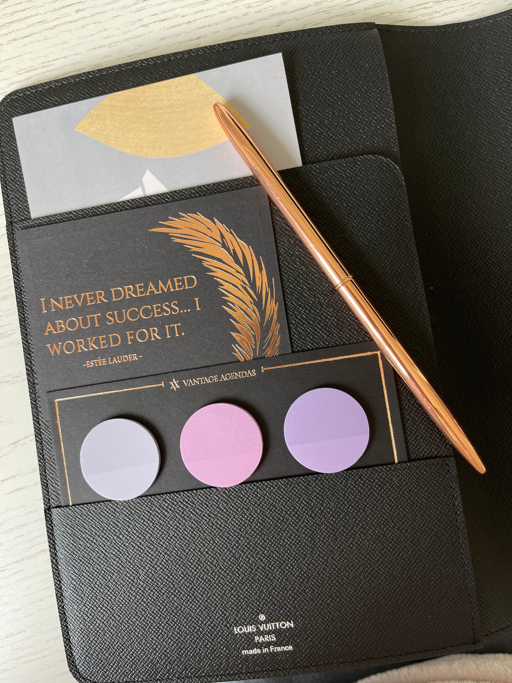 30 of each colour of transparent circle sticky note on our signature black backing card with rose gold foil detailing.