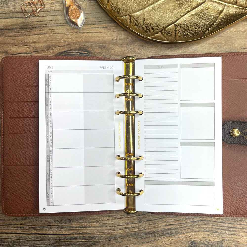 The 2025 Weekly Insert is suitable for any standard personal sized 6 ring agenda cover. (For Louis Vuitton size MM / Medium)